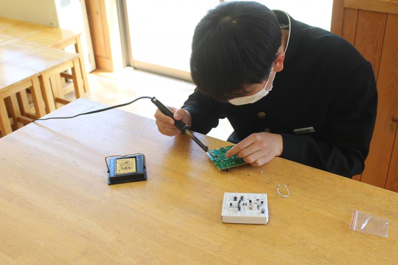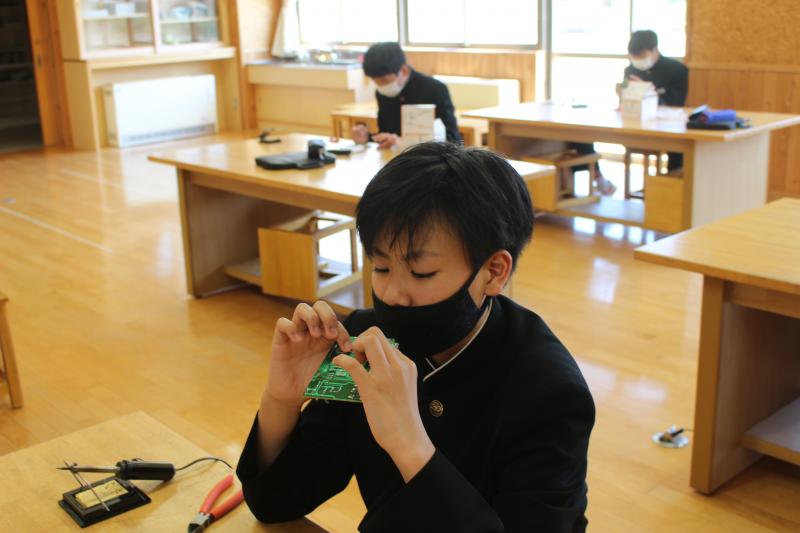 エコキューブラジオの製作にあたり、今日はプリント基板に電子部品を接合する半田付けに挑戦しました。慣れない作業に苦戦する様子も見られましたが、安全に留意しながら意欲的に取り組むことができました。