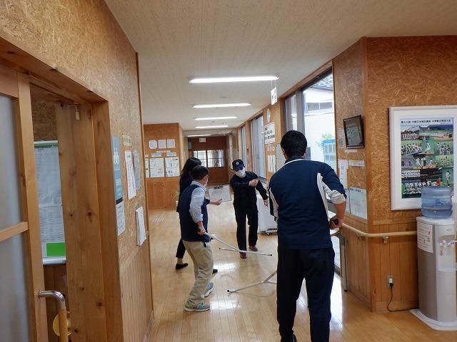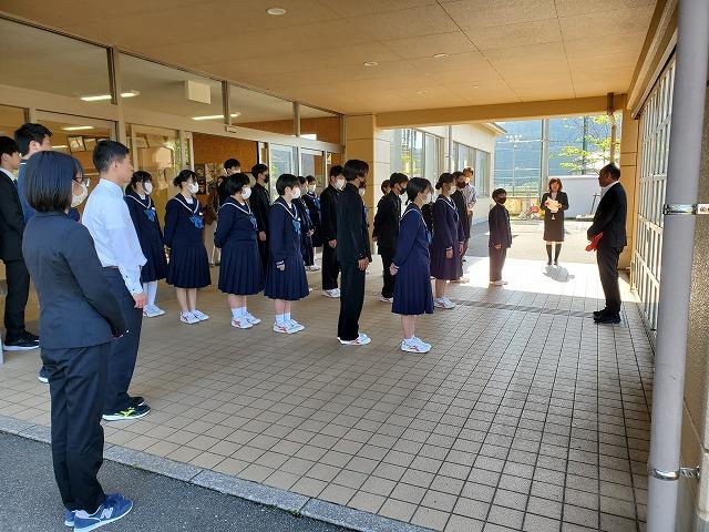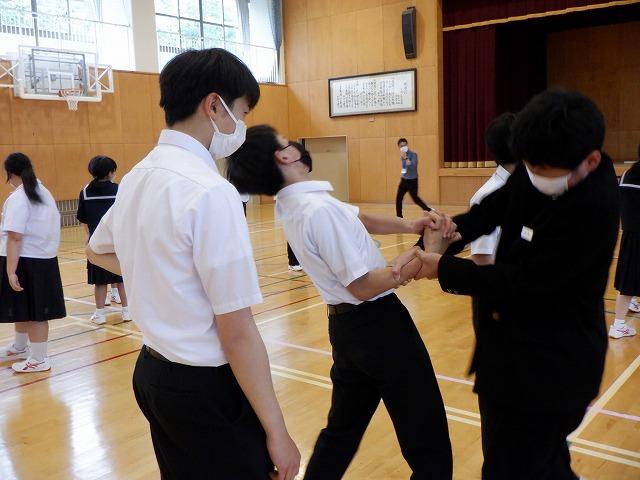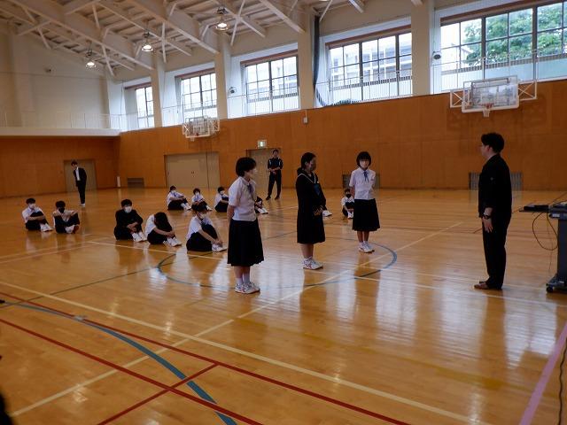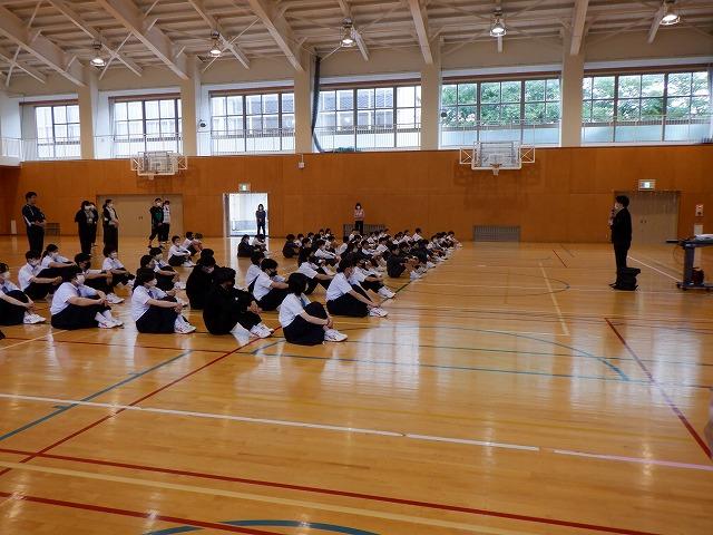 ②町野小学と「不審者」を想定した合同避難訓練を行いました。今回は東陽中学校に不審者が侵入した想定です。事前に知らせてある合図を元に、生徒は避難を開始しました。無事に避難した後は、防犯教室を開きました。輪島警察署の方から「護身術」を教えていただきましたが、身を守るために大事なことは「まずは逃げること」「大声を出す」ことです。訓練に取り組むことで自分の命を守る知識が増えると思います。