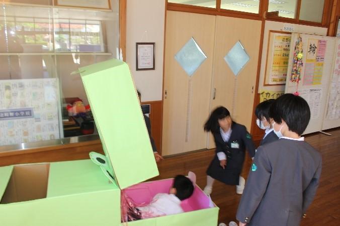 文化部の生徒が約1カ月かけて制作したワニの遊具が遂に完成しました。その名も「ワニ山」さん。現在、町野小学校の玄関ホールに設置されています。昼休みには多くの小学生が楽しそうに遊ぶ姿が見られ、中学生全員が温かな表情で見守っていました。制作した文化部の生徒は、「小学生が楽しそうに遊んでくれたので良かったです。」と嬉しそうでした。