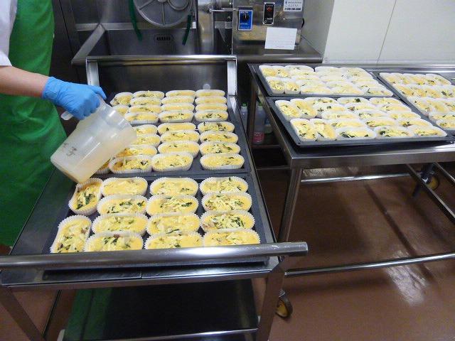 玉ねぎやエリンギ、ハムなどを炒めて、味付けしたものをカップに入れてから、卵と牛乳を混ぜたものを流し入れ、