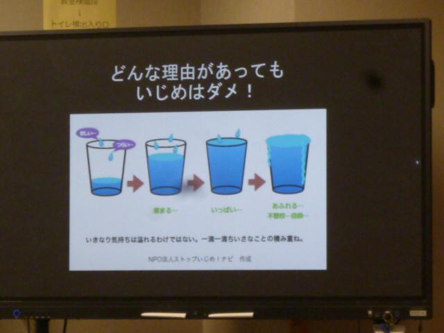 子供たちは、「どんなことがいじめに当たるの?」「なぜ、いじめが起こってしまうの?」などについて真剣に考えながら、北村先生のお話に熱心に耳を傾けていました。北村先生からは、「感情にまかせて行動してはいけないこと」「1回、深呼吸してから考えて次の行動に移るとよいこと」「心の中のコップ」などについて学びました。