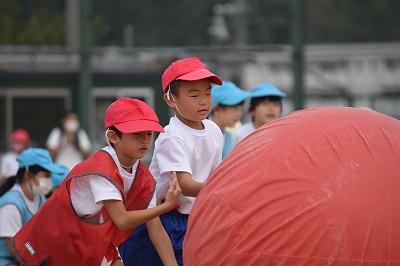 1年生は、初めての運動会でした。自分の体と同じくらいの大玉は、真っすぐ転がすのも大変ですが、一生懸命頑張りました。2年生は、お兄さん、お姉さんとして立派な姿を見せてくれました。友達と協力し、全力を尽くして大玉を運びました。