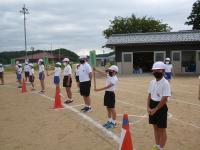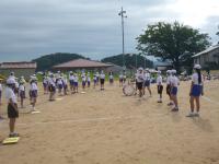 月曜日の朝から運動場は熱気があります。3・4年生が団体競技の大玉運びの練習をしています。