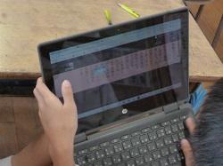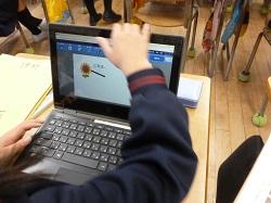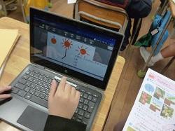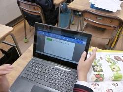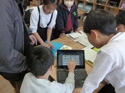 「上」という漢字の読み方を、教科書やタブレットを使って一生懸命調べる2年生。