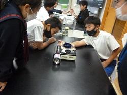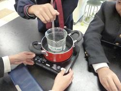 鉄の棒の温まり方をグループで力を合わせて調べる4年生。