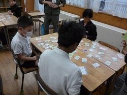 津幡町観光ボランティアつばたふるさと探検団の方に来ていただき、45枚のかるたを作るとき