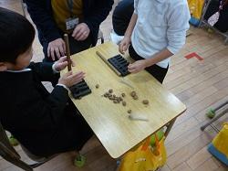 今日の2・3時間目に、1年生が昔遊び体験をしました。
