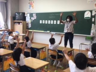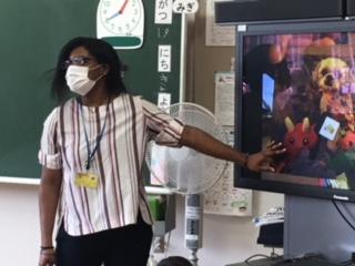 1年生は、先週初めてALTのSade Moore(シャーデー モーア)さんと一緒に英語活動に取り組みました。初めは、自己紹介です。Sadeさんの好きなものや家族を写真をもとに英語交じりで紹介してもらいました。
