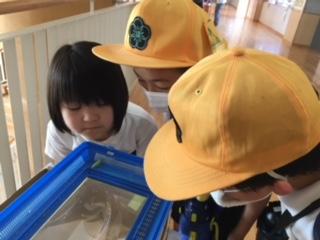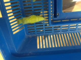 先日お知らせした幼虫が、さなぎになりました。羽化するのを楽しみにしている子供たちです!
