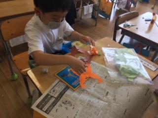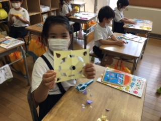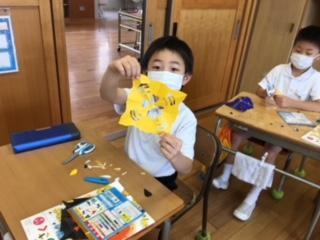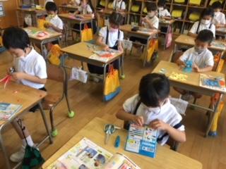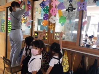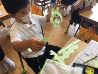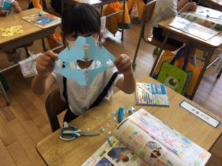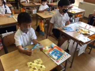 今週図工の時間、1年生が、色紙とはさみを使って、楽しく創作活動をしていました。折ったり重ねたりした色紙を切ると思いがけない形が出来上がり、歓声を上げながら作っていました。出来上がったカラフル飾りは、教室前の廊下に掲示され、どの1年教室も楽しい雰囲気になりました。