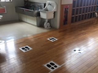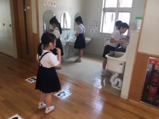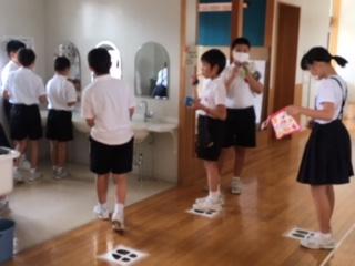 コロナ対策として手洗いを励行していますが、手洗い場での3密を防ぐため、足形を張っています。この足形をもとにソーシャルディスタンスを意識して、子どもたちは、手洗いや歯みがきをしています。どちらも命・健康を守る大事な行動です。おうちでも、手洗い・歯磨きを続けてくださいね。