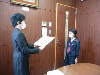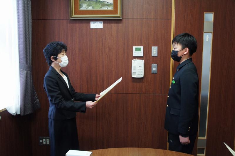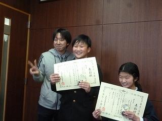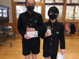 27日(水)昼休みに、先日開催された津幡町英語スピーチコンテストの入賞者の表彰式を行いました。見事「優秀賞」を受賞した小学生スピーチ部門の5年女子児童とプレゼンスピーチ部門の6年男子児童に、賞状と記念トロフィーが校長から手渡されました。よく頑張りましたね。本当におめでとう!