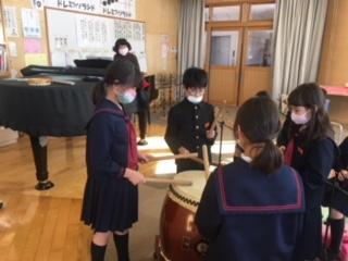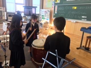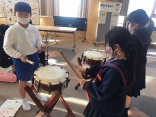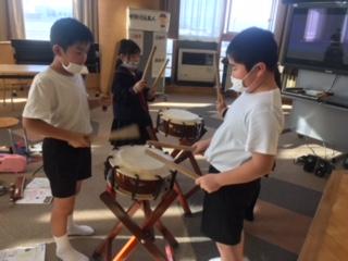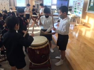 3年生の音楽科では、お祭りの音楽を鑑賞し、郷土に伝わる音楽に親しむ学習に取り組んでいます。この日は、3年3組の子ども達が、締太鼓や長胴太鼓を使って、ばちの持ち方や打ち方を演奏しながら学んでいました。津幡のお祭りは盛んなので、どの子もリズムに乗って楽しく演奏していました。