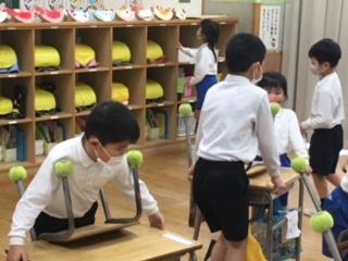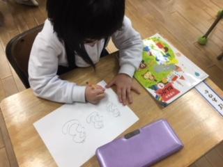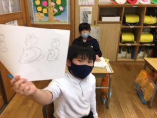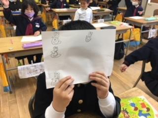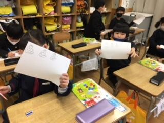 1年3組の子ども達が、音楽の時間に絵かき歌の学習をしていました。初めは、担任の先生の歌に合わせて絵を描いていましたが、何回も描いている間に自然とみんなで「さんちゃんが~」と口ずさみながら、楽しく歌って描いていました。日本のわらべ歌のよさを味わい、語り継げるといいですね。