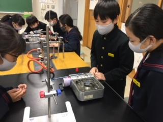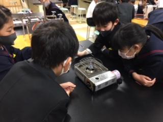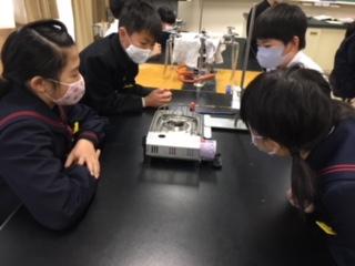 4年2組の子ども達が、理科室で実験をしていました。金属の温まり方について一人一人予想したことを、グループごとに加熱器具を使って調べ、まとめていました。加熱器具でやけどをしないように気を付けながら、しっかりと観察していました。