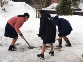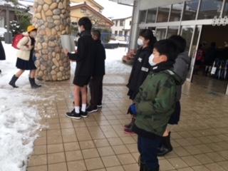 今朝再び大雪の朝を迎えました。雪が積もり玄関前の通路がまた通りにくくなっていたため、除雪当番の6年1組の子ども達が、先生方と一緒に除雪をしてくれました。生活委員会の子ども達は、寒い中あいさつ運動をしていました。毎日元気なあいさつを続けてくれて、ありがとう!
