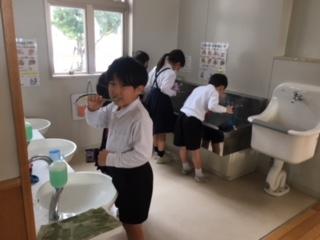 4年生も、ソーシャルディスタンスをとりながら、しっかりと磨いていました。全員歯みがきできたかチェックできるように、磨いた子はネームを動かしていました。