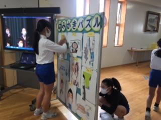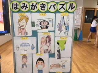 昼休み、保健委員会の子ども達が、歯磨きパズルのピースを貼っていました。どのクラスもパズルが完成に近づいてきました。