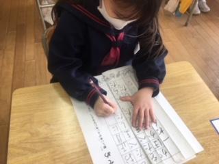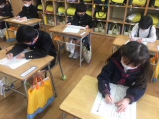 書き初め初挑戦の1学年は、手本を見ながら、はね・とめ・はらいに気を付けてマス目に大きく書いていました。