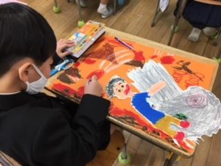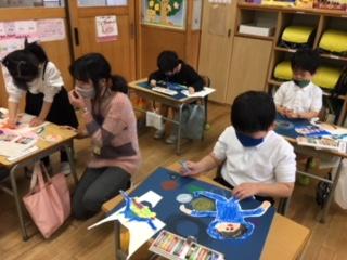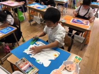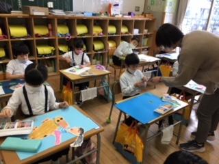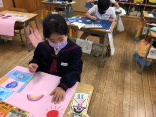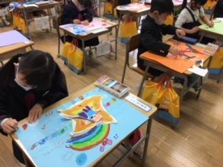 1年生が、乗ってみたいものや行ってみたい場所を想像しながら、楽しく絵を描いていました。自分のイメージを表現するために、好きな形や色を選んだり、いろいろな形や色を考えたりしながら、旅行している気分で楽しそうに書いていました。