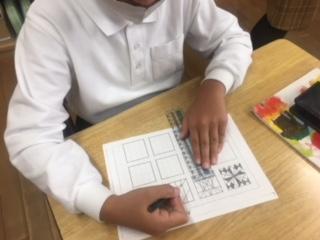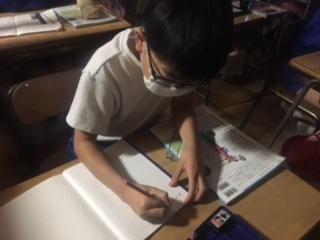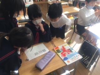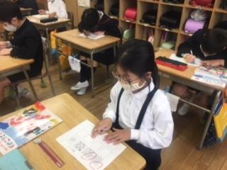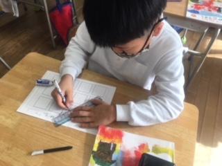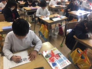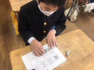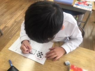 2年生が、方眼を利用して模様づくりをしていました。規則性のある模様を並べることで、きれいな模様や不思議な模様が次々とできあがり、子ども達は友達の作品と比べながら楽しんで描いていました。