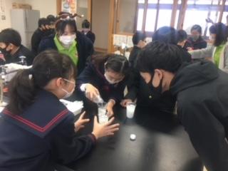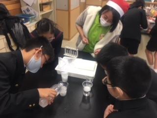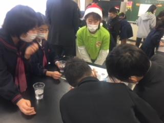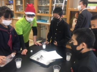 17日(木)5年生が、金沢星稜大学の学生6名と一緒に理科実験の学習に取り組みました。石けん水やジュースに食塩を混ぜるといろんな変化が起こることに驚きの声を上げながら、子ども達は楽しく「食塩の働き」について学んでいました。大学生たちは、この日のために実験道具や材料を用意し、クリスマスの装いで楽しい雰囲気もつくってくれていました。教員を目指す学生にとっても、よい経験になったことと思います。