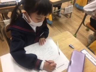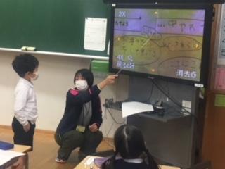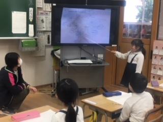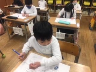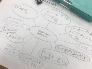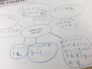 1年生が、自分の生活を振り返りながら、家族の笑顔を増やすためにはどうしたらよいか、言葉のマップを使いながら話し合っていました。友だちの意見を聞きながら、まず自分のことをしっかりとして家族に迷惑をかけないことや、家族の一員として自分ができる仕事をしていけばよいことに気づいていました。冬休みを迎えるまでに、自分ですることを決め、ぜひチャレンジしてみてくださいね。