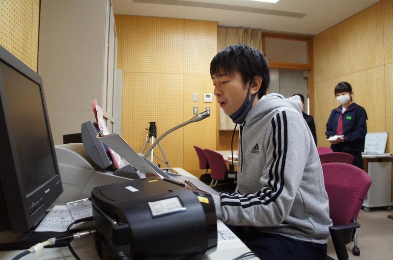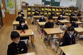26日(木)朝放送で、学校集会を行いました。教頭先生の司会のもと、校歌斉唱から始まりました。