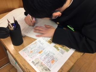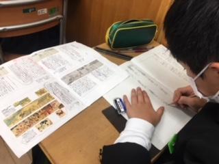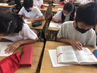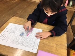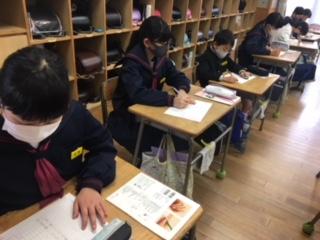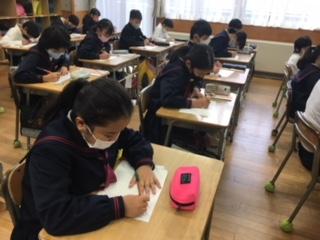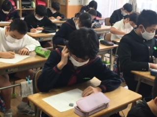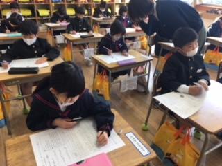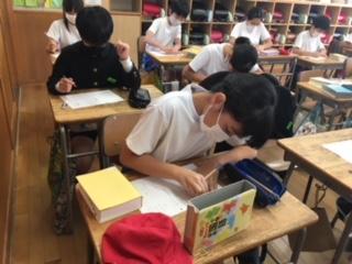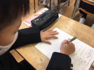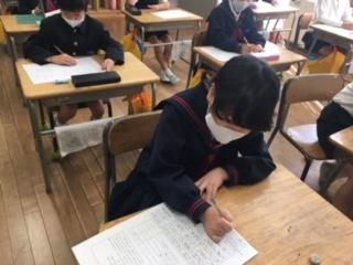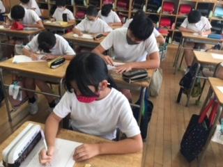 高学年の様子です。モデル文の提示がなくても、自分で考えて書いていました。必要に応じて辞書を用いている子もいて、国語科での学びが日常に生かされていることを感じました。