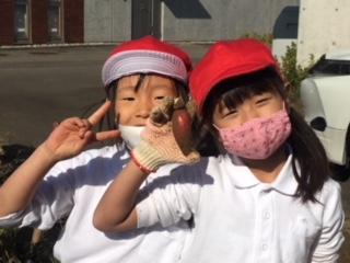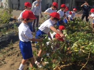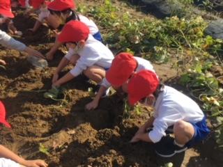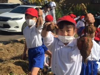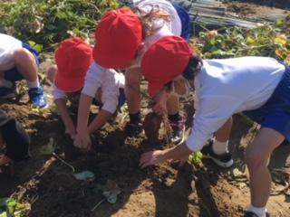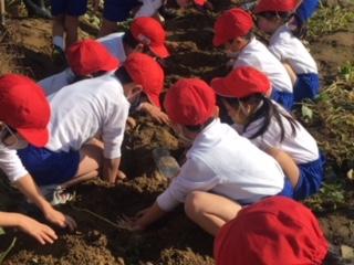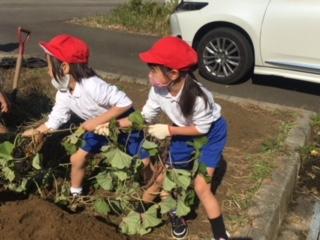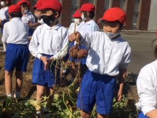12日(木)1年1組が芋ほりをしていました。長い芋の蔓をみんなで「うんとこしょ、どっこいしょ。」と掛け声をかけて引っ張り、芋を掘り起こすたびに歓声が上がっていました。