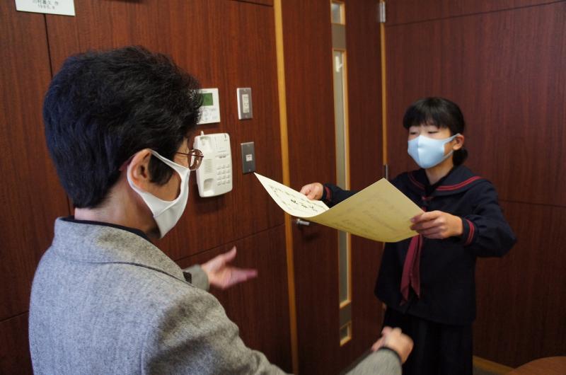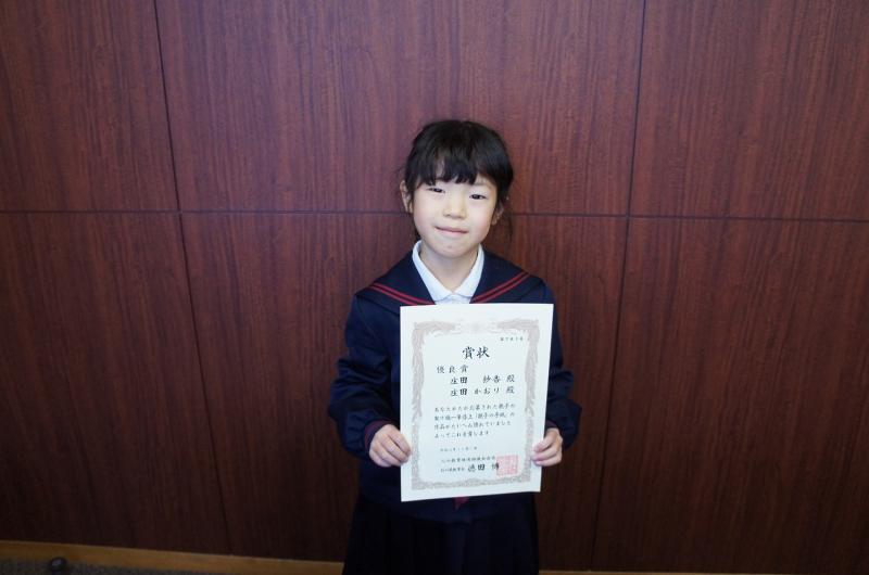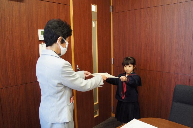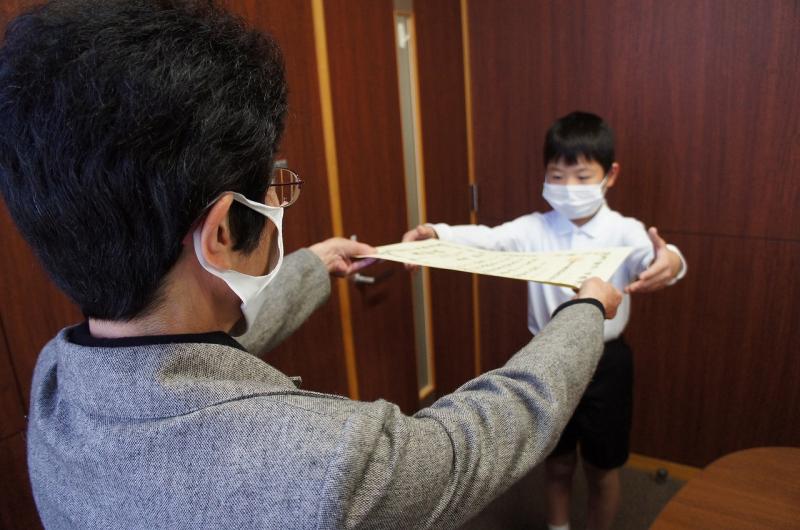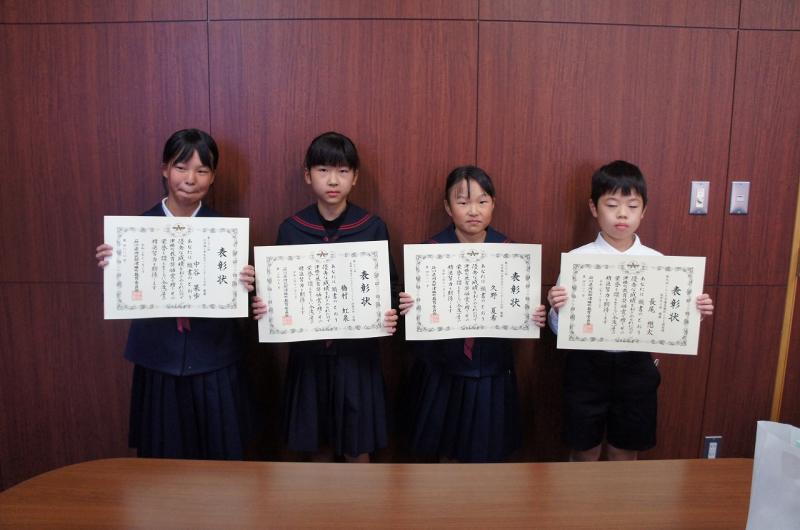 今月、町教育奨励賞や親子の手紙表彰の表彰式に参加できなかった児童の表彰状が学校に届いたので、応接室でミニ表彰式を行いました。教職員が見守る中、代読した校長から一人一人嬉しそうに表彰状を受け取っていました。このコロナ禍でも、いろんな分野で活躍する児童がいて、学校にとっても励みとなりました。