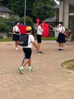 運動会に使用する赤と白の旗を振ってのあいさつ運動です。