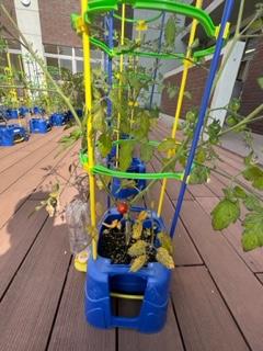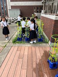 1年生は、毎日朝の水やりです。伸びてくる蔓を上手に巻き付けています。