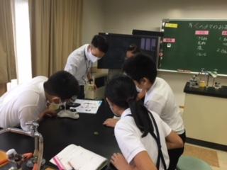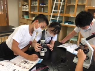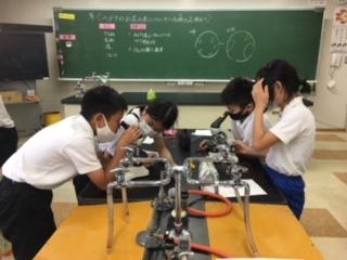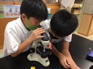 9月7日(月)5年生が、顕微鏡を使って「おしべ」の観察をしていました。顕微鏡をはじめて学習する5年生。接眼レンズ・対物レンズや反射鏡を友だちと相談しながら調節し、観察していました。教科書に載っている写真と同じ様子を観察できたグループからは、歓声が上がり、感動しながら学習していました。