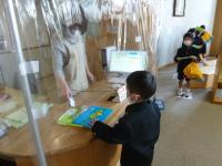 1年生が図書館で本を借りています。貸出コーナーの前に並んでいますが、静かに、距離をとって並んでいます。
