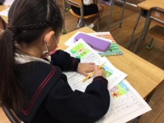 2年生が、国語の時間、お話の作者になって絵本作りをしています。8日(金)2限目、挿絵を貼り、下書きをもとに丁寧に清書をしていました。世界に1つしかない物語を作り、素敵な絵本ができそうです!