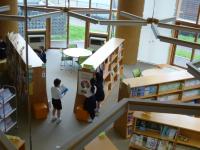 図書館は吹き抜けでとても気持ちのよい場所です。3年生が図書館で本を借りています。
