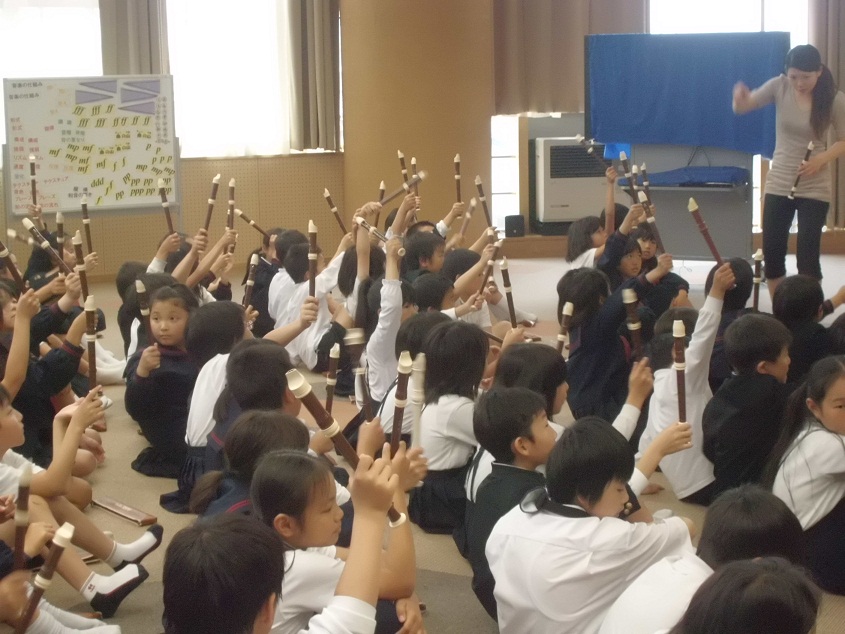 まず、5月26日(月)に行われたリコーダー講習会の様子です。東京から、リコーダーの講師の先生がおいでて、リコーダーの扱い方について学習しているところです。東京から来られた講師の先生に、リコーダーのいろいろな種類の実物と音を聞かせていただき、実際に自分達のリコーダーの音を出してみました。上手に二重奏や三重奏ができるようになるといいですね。