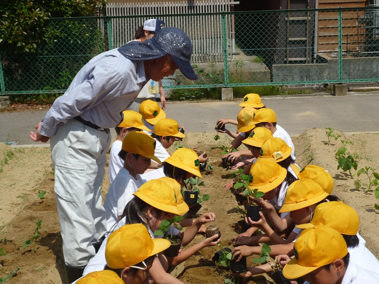いつも来ていただいているゲストティチャー加茂さんの御指導で、一本ずつ丁寧に植えていきます。この暑い日差しにぐんぐん大きくなり、たくさん大豆が収穫できたらいいですね。