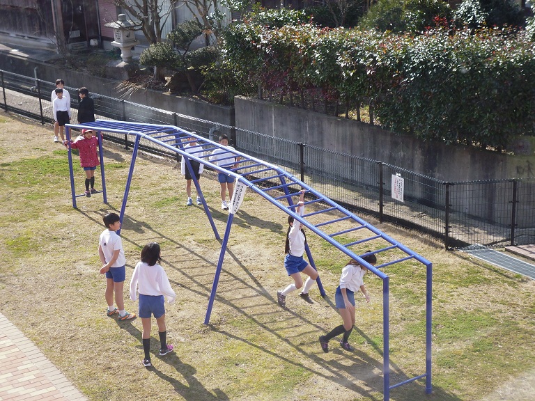 2月5日(木)2限目 6年生の合同体育の時間に、PTAの皆様にご協力いただいて、設置していただいた雲梯(うんてい)のお披露目をしました。