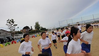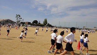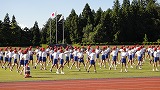 100m走、8の字跳び、ロケットボール投げ,集団演技,学校対抗リレーが行われました。