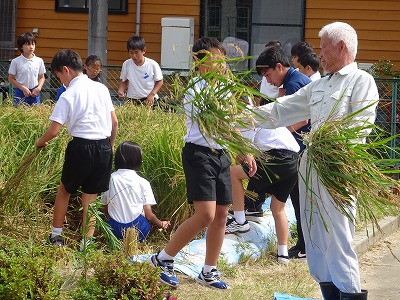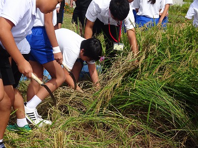 9月15日(金)、5年生が、学校の田んぼで稲刈りを行いました。