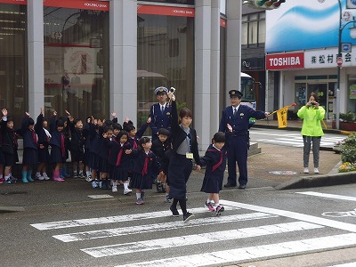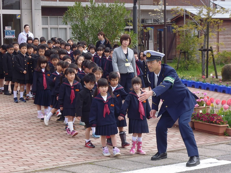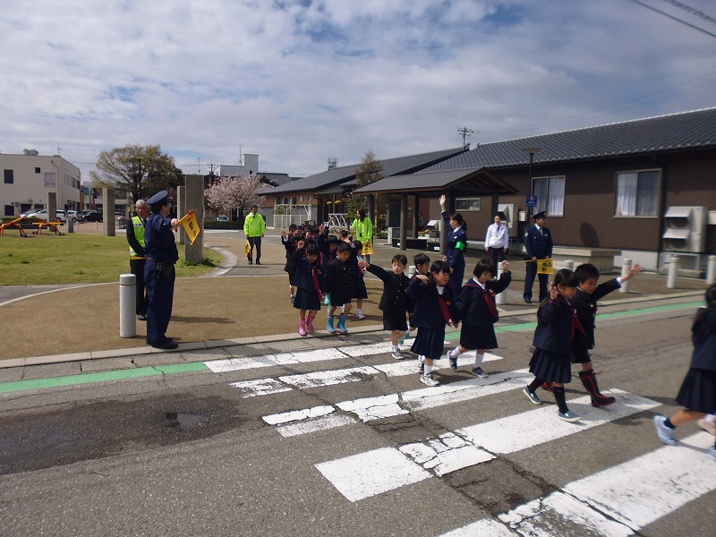津幡警察署、津幡町役場、町交通安全協会の方々にご協力いただき、登下校や放課後の安全な過ごし方について教えていただきました。