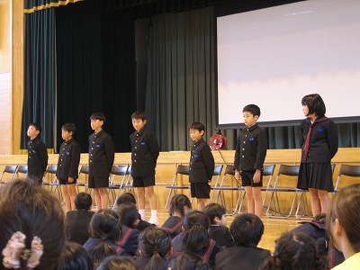 4月25日(水)6時間目の全校集会の中で、ささやかですが「感謝の会」を行いました。登下校の安全を見守ってくださる津幡っ子見守り隊、読み聞かせや制作会をしてくださる図書ボランティアの方々をお迎えし、6年生児童代表からのお礼の言葉と、お花の鉢をプレゼントしました。また、集会の後半には、「児童集会」があり、今年度の児童会前期委員長から、今年度のめあてや抱負、全校児童へのお願い等が発表されました。どの委員長も堂々とした態度で、各委員会からの思いを伝えることができました。高学年の皆さん、よきリーダーとしての活躍を期待しています。