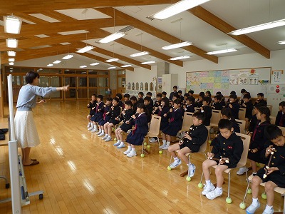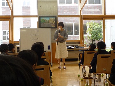 外部から講師の先生をお迎えし、リコーダーの演奏の仕方を習ったり、色々な曲を演奏して頂いたりしました。先生には色々な大きさのリコーダーを持ってきていただき、中には大人の背ぐらいの大きさのリコーダーもあり、子どもたちは歓声を上げていました。