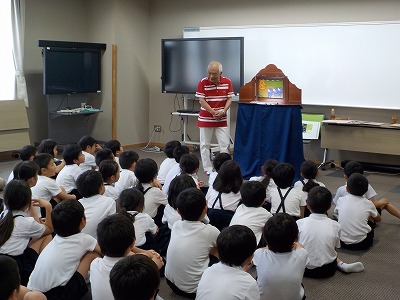 昨年まではランチルームで2学年一斉に行っていましたが、今年は、こじんまりとした中でより間近に紙芝居を味わうために、多目的室で1学年ごとに実施することにしました。子どもたちは、『となりのさくら』『まんまるまんまたんたかたん』等の4作品を観ながら、すっかり〈のまりんの世界〉に引き込まれていました。6月には、4・5・6年生を対象に実施する予定です。