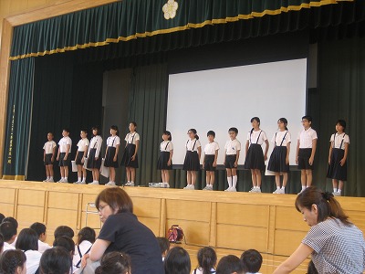 後半の児童集会では、美化委員会から『そうじがんばり週間』についての説明がありました。①無言清掃②時間を守る③すみずみまで④正しい服装⑤用具の片付けについて、そうじ場所ごとにふり返りながら意識を高めてほしいと思います。