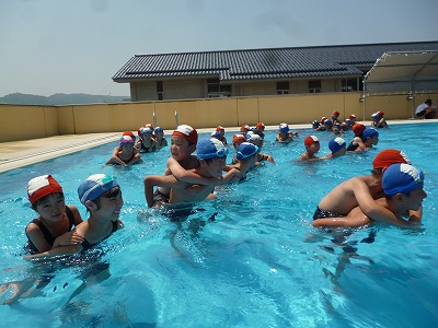 当日は、おんぶをして「洗濯機」をしたり、「ジャンケン列車」「おにごっこ」などをして楽しみました。プールにまだ慣れていない1年生も、6年生と一緒なら心強かったようです。お互いに良い経験になりました。