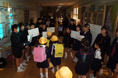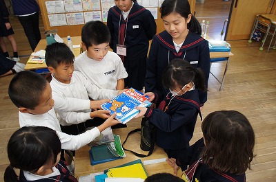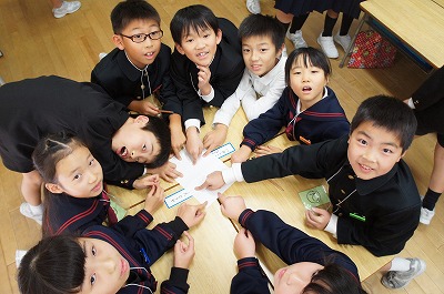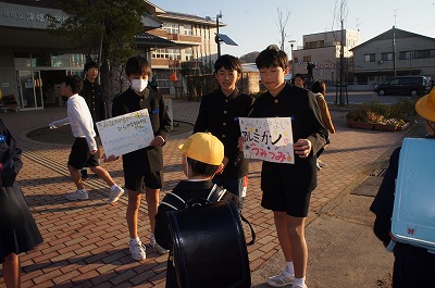この日までに、6年生を中心に、なかよしグループで話し合ってお店を決め、準備をしてきました。当日の朝には、6年生が玄関前であいさつをしながら、お店の宣伝をしていました。