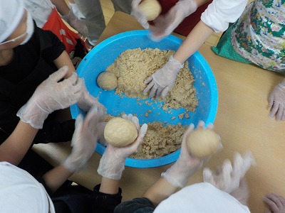 子どもたちは事前に味噌の作り方について学習していましたが、実際にミンサーを使って大豆をつぶすところにはびっくりしていました。また、塩と麹を混ぜたり、味噌を樽に投げ入れたりする工程は、みんなで楽しみながらできました。